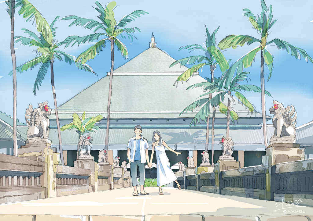 Sejak kunjungan pertamanya ke Bali, Wamizu telah terinspirasi oleh keunikan seni dan budaya Bali, khususnya kecantikan Jimbaran Bay. “Setiap menit, langit dan atmosfir di sekitar resort berubah warna. Saya terpesona oleh keindahan taman, kolam renang, hingga kehadiran kuil dengan pohon keramat di sekitarnya. It’s truly a paradise,” ungkap Wamizu. Maka dari itu, seniman yang dikenal oleh line-drawing dan watercolor style ini menyalurkan perasaannya ke sepuluh kanvas untuk dipersembahkan ke InterContinental Bali Resort.