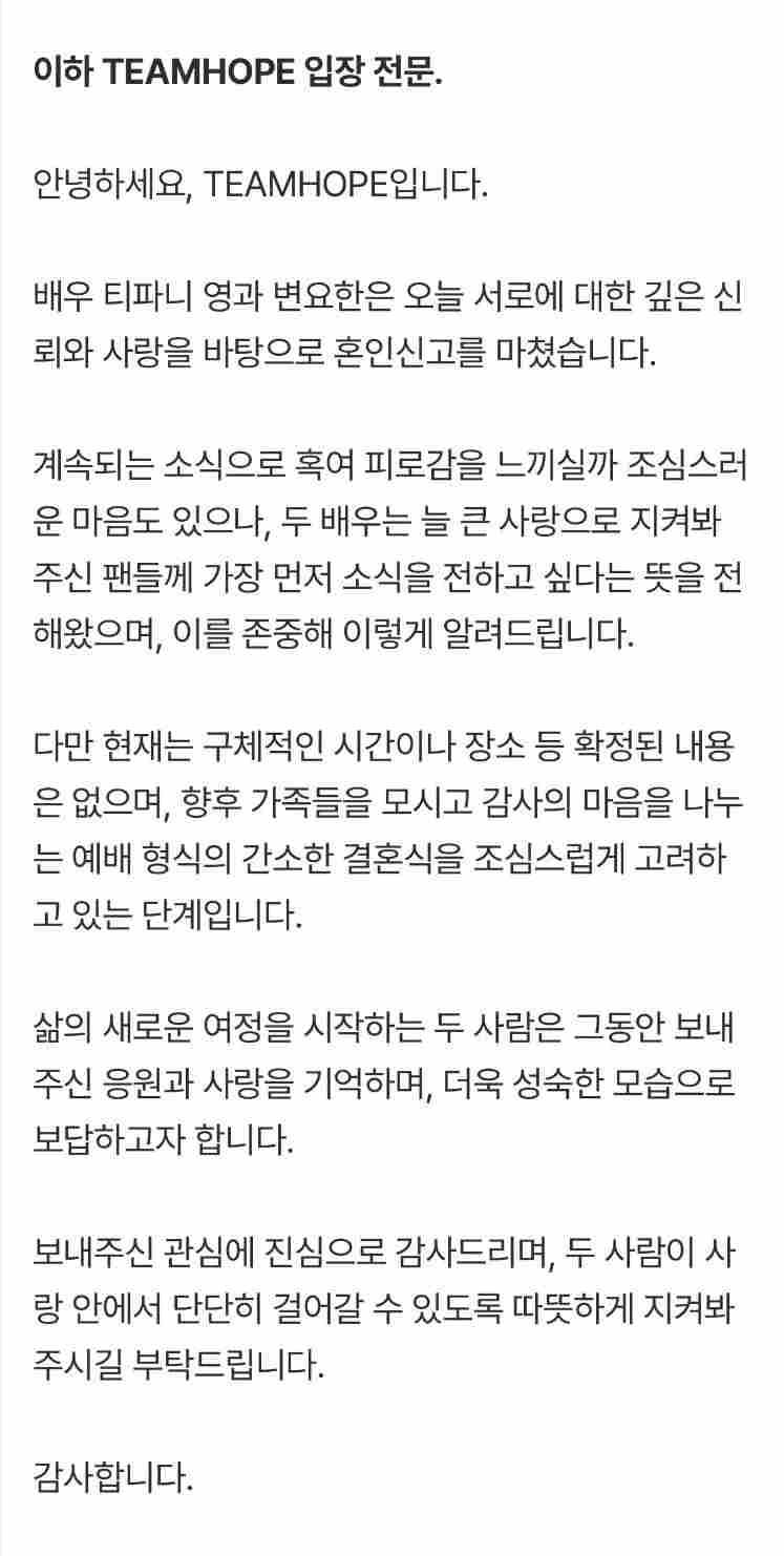 Aktris Tiffany Young dan Byun Yo Han telah menyelesaikan pendaftaran pernikahan mereka hari ini, hal tersebut didasari oleh kepercayaan dan cinta yang mendalam satu sama lain.