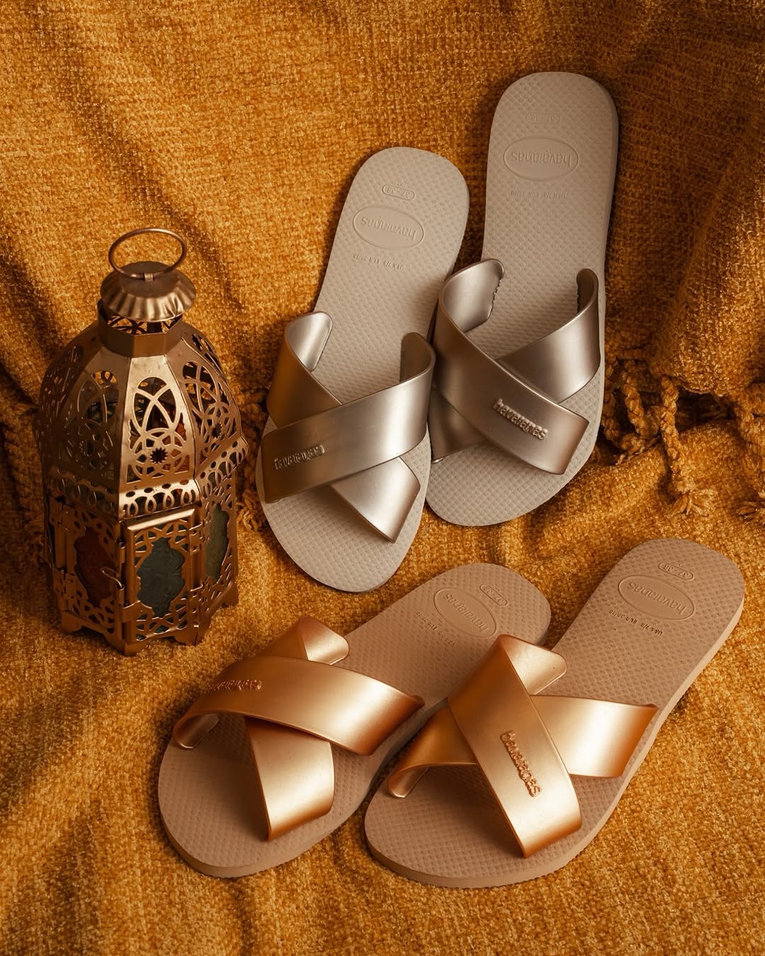 Kalau ingin tampil lebih kasual dan mengutamakan kenyamanan saat bersilaturahmi rumah-ke-rumah di Hari Lebaran nanti, Cosmo merekomendasikan koleksi Ramadan 2025 dari Havaianas. Model sandal slip on dengan strap lebar berbentuk X ini hadir dalam dua pilihan warna yaitu gold dan bronze. So chic! Soal kenyamanan, sejak dulu Havaianas terkenal dengan desain sol yang empuk--sejauh apapun kamu melangkah.