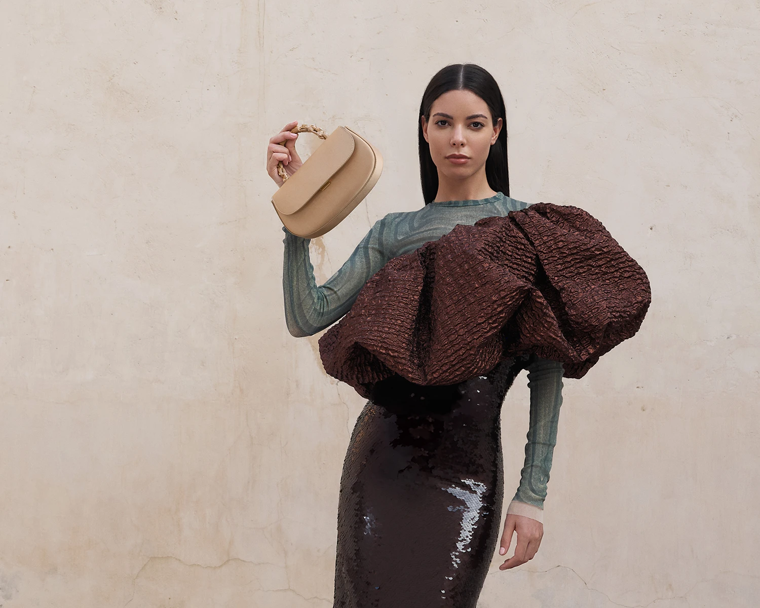 Fokus utama pada lini tas adalah Eilian Satin Braided Top Handle Bag yang menampilkan siluet feminin yang sleek dengan finishing satin yang lembut serta detail braided-handle yang unik. Tas ini cocok dipadukan dengan abaya modern berwarna earth tone atau setelan tunik sutra untuk memberikan kesan minimalis yang tetap fashionable.