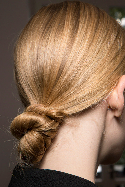 Tatanan sleek ini amat mudah dicontoh! Sisir rambut ke belakang, beri gel sedikit agar tatanan lebih tahan lama, gulung rambut di tengkuk dan jepit dengan bobby pins. Kenakan lipstik merah agar dandanan makin chic!