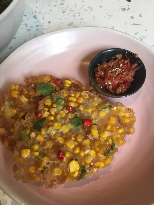 Di menu pembuka, Cosmo mencicipi Feast Fritters yang merupakan perkedel jagung khas Manado.