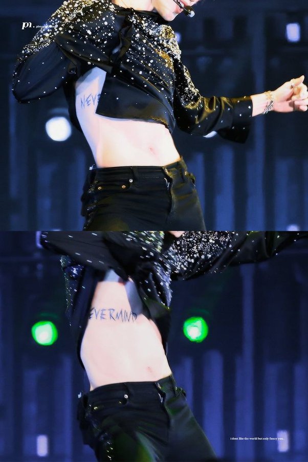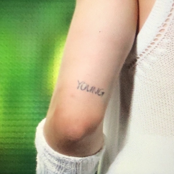 Di antaranya tato bertuliskan “NEVERMIND” di area perut bagian atasnya, lalu dua tato “Young” dan “Forever” yang terlihat menyambung dan terpampang di bagian lengan kiri dan kananya.