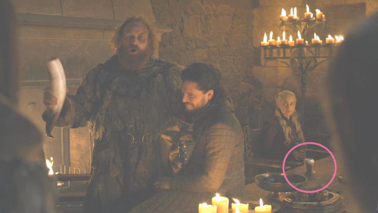 Momen yang ‘dipertanyakan’ tersebut adalah saat adegan menampilkan pesta makan malam di Winterfell untuk merayakan kesuksesan mengalahkan White Walkers, dan tepatnya saat Daenerys Targaryen melirik kekasih sekaligus keponakannya, Jon Snow. Adegan ini seharusnya bisa menjadi sangat powerful, jika bukan karena fakta bahwa Daenerys duduk di depan gelas kopi yang sangat kasual.