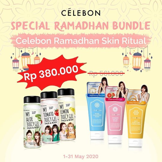 Orang yang akan menerima parsel Ramadan ini akan merasa dimanjakan, karena ia akan mendapatkan enam produk—yup, enam! Paket ini terdiri dari rangkaian pembersih wajah CELEBON, yaitu Pearl Cleansing Foam, Rice Pore-Face Scrub Foam, dan Vitamin Facial Foam. Dan seakan-akan satu saja tidak cukup, dihadirkan pula tiga macam gel aloe vera CELEBON dalam paket ini—bisa menjadi persediaan selama setahun ke depan!
