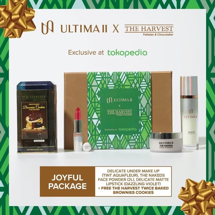 Jika ingin memberikan parsel Ramadan yang berisi kosmetik sekaligus kue kering untuk dinikmati, Ultima II berikan solusinya untukmu. Label kecantikan asal New York ini menghadirkan bundle berisi Under Makeup Tint Aquafleur, Naked Face Powder, Delicate Matte Dazzling Violet, serta Twice Baked Brownie dari toko kue kenamaan, The Harvest. Orang yang menerima parsel ini tentunya akan merasa senang dengan koleksi makeup barunya yang ditemani dengan kudapan istimewa!