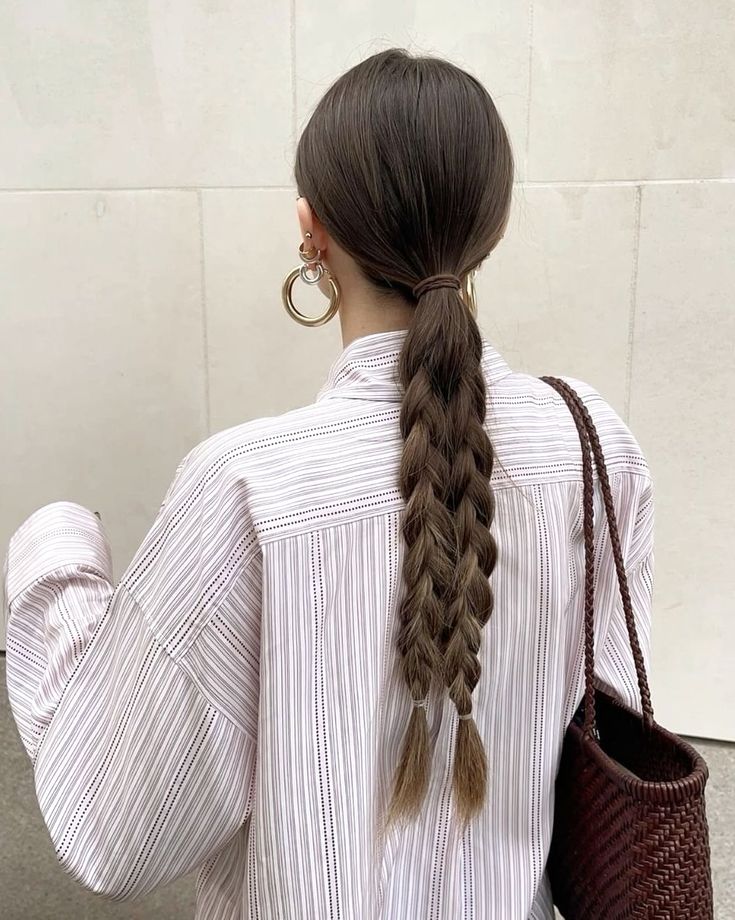 - Kepang masing-masing bagian secara terpisah menggunakan teknik three-strand braid klasik, lalu ikat ujungnya dengan karet kecil.