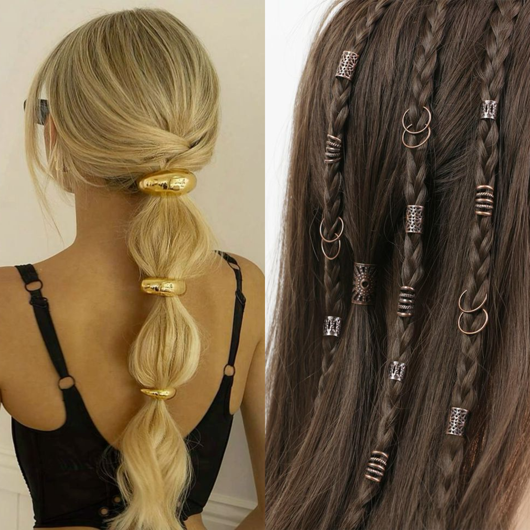 Untuk kamu yang menyukai dekorasi rambut dengan sentuhan minimal namun tetap memikat, cincin rambut dan hair cuffs metalik adalah detail kecil yang mampu memberikan dampak besar. Aksesori mungil ini dirancang untuk diselipkan ke dalam kepangan atau ditempatkan pada bagian tertentu rambut, menghadirkan kilau halus dan nuansa bohemian yang effortless.