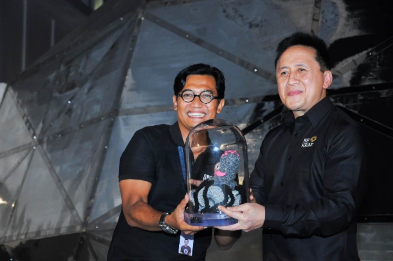 Penyerahan cinderamata kepada Triawan Munaf (Kepala Badan Ekonomi Kreatif Indonesia).