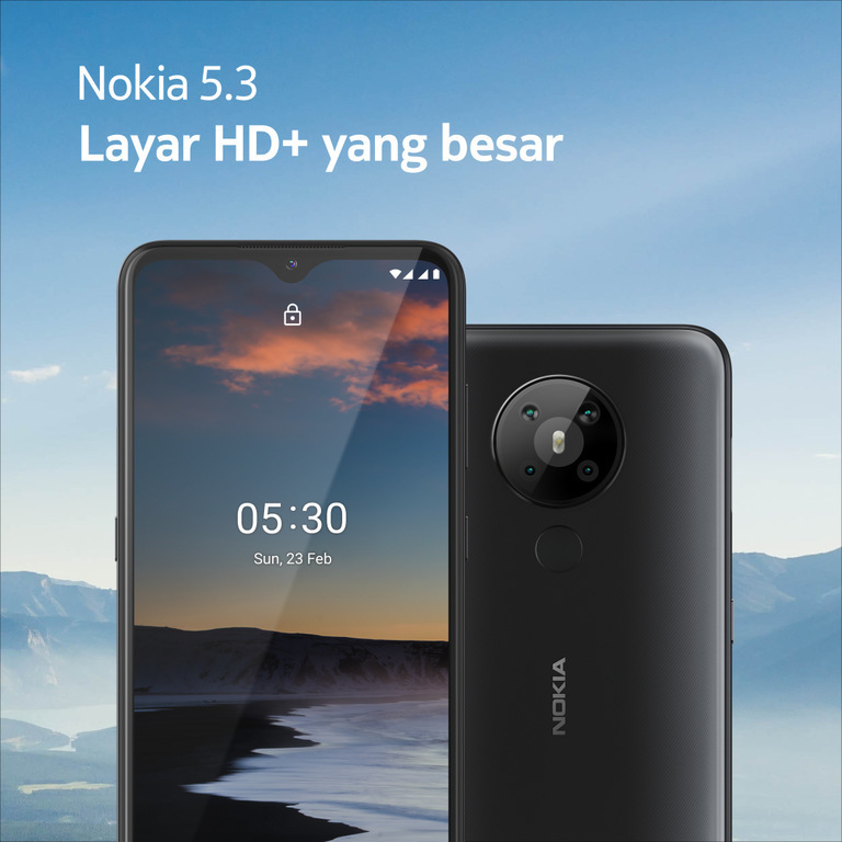 Menyangsa pangsa pasar kaum urban yang memiliki hobi fotografi dan membuat konten, Nokia pun merilis Nokia 5.3. Nokia 5.3 dibekali dengan quad camera, Qualcomm® Snapdragon™ 665 Mobile Platform dan umur baterai andalan 2 hari. Quad camera dengan dukungan AI menjadikan pengambilan gambar sempurna kamu sempurna, dimanapun lokasinya. Smartphone ini juga memiliki layar berukuran 6.55”, Nokia 5.3 menjadikan Anda betah berlama-lama streaming tayangan favorit dan memainkan game sepanjang hari. Berbeda dengan smartphone lainnya, Nokia 5.3 diciptakan dengan desain memukau yang mengambil inspirasi khas Skandinavia, Android™ 10 dan tombol khusus Google Assistant untuk akses yang lebih cepat. Selain itu seperti halnya kita mengenal Nokia dengan daya tahan baterainya yang powerful, Nokia 5.3 memiliki baterai 4000mAh battery dan fitur AI-assisted Adaptive Battery, membantu kamu melakukan streaming berbagai tayangan dan bermain game tanpa mengkhawatirkan pengisian baterai.