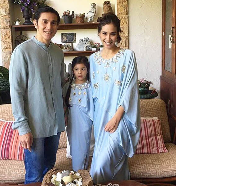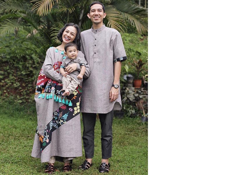 Penyanyi satu ini memang selalu sukses memilih pakaian dengan penuh karakter dan stylish tentunya. Ia mengenakan kaftan berpalet taupe yang sama dengan sang suami dan anak. Kaftan tersebut jadi lebih unik berkat aksen kain motif tenun dan tassels berwarna biru yang terlihat cerah. One of a kind!