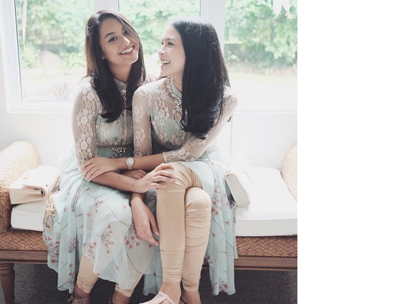 Maudy mengenakan pakaian yang seragam dengan adiknya, yaitu dress brokat dalam warna hijau mint. Detail embellishment di bagian leher terlihat serasi ya dengan motif floral feminin! Lalu ia mengenakan celana skinny dalam warna nude yang terlihat lembut.