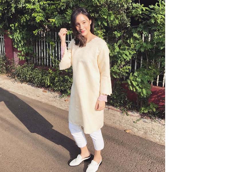 Aktris belia ini memilih palet baby yellow untuk tunik yang Ia kenakan saat Lebaran. Tunik simpel ini semakin feminin dengan aksen brokat pink muda di bagian lengan. Lalu, Tatjana memadankannya dengan cropped pants dan mules dalan warna putih. Pretty, young and effortless!