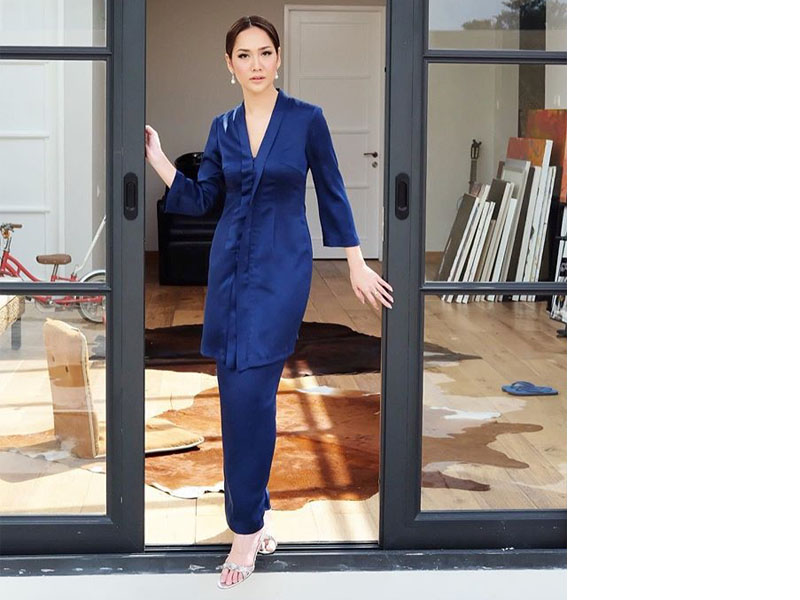 Jika kebanyakan wanita mengenakan kaftan, sang aktris sekaligus penyanyi ini mengenakan kebaya kutubaru dan rok dalam warna royal blue dan material satin. Gayanya yang classy ini dipercantik dengan hair updo simpel dan anting kecil. She looked so divine!