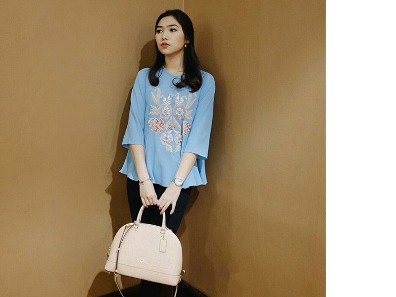 Wanita cantik ini terlihat simpel namun tetap modis dan feminin dalam balutan blus berwarna biru langit dan celana panjang hitam. Aksen embroidery pada bagian depan blus membuat ia terlihat stunning. Tas pink pastel juga matching dengan pakaiannya! Gaya ini sangat pas untuk silaturahmi ke rumah keluarga, effortlessly pretty!