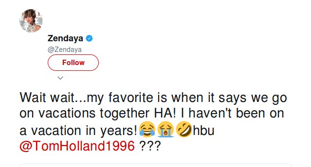 Namun, sebelum Anda merayakan kabar gembira tersebut, sang aktris dan aktor nampaknya menganggap semua ini sebagai lelucon belaka. Pada akun Twitter, Zendaya (yang memiliki lebih dari 8 juta followers), mengaku bahwa ia belum pernah pergi liburan selama bertahun-tahun. Ia pun melemparkan pertanyaan pada Tom, “bagaimana dengan Anda?”