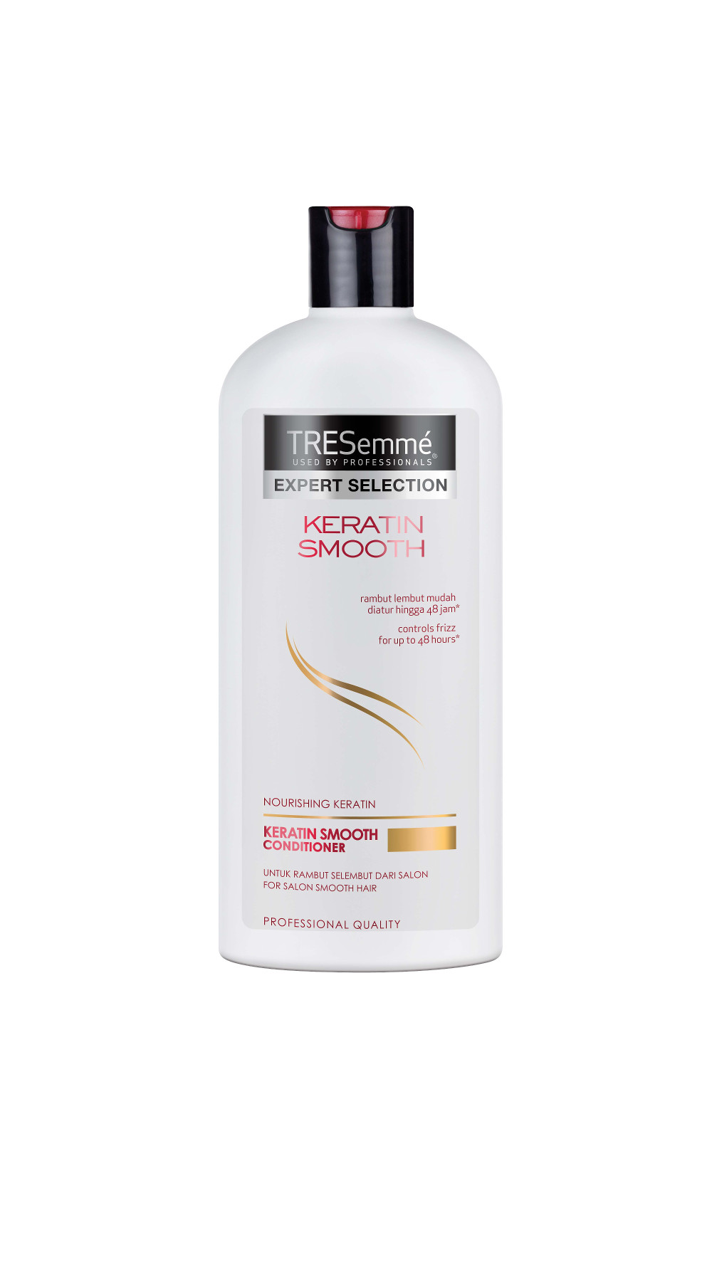 3. Setelah menggunakan shampoo, penggunaan kondisioner setelahnya juga tak kalah penting. Permasalahan rambut mengembang dan kusut adalah kurangnya kadar air dalam rambut. Namun, udara yang lembap juga dapat jadi penyebabnya. Ya, saat beraktifitas, rambut Anda kehilangan kelembapan, jadi kutikel rambut, atau lapisan paling luar dari batang rambut Anda terbuka dan menyerap udara sekitar, yang membuat rambut jadi frizzy dan susah diatur! Jadi, gunakan juga kondisioner mengandung keratin dan gliserin untuk menjaga kelembapan rambut. Cosmo loves: Tresemmé Keratin Smooth Conditioner.