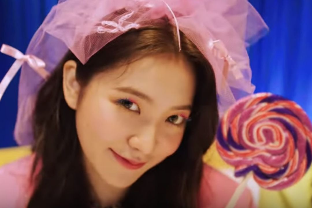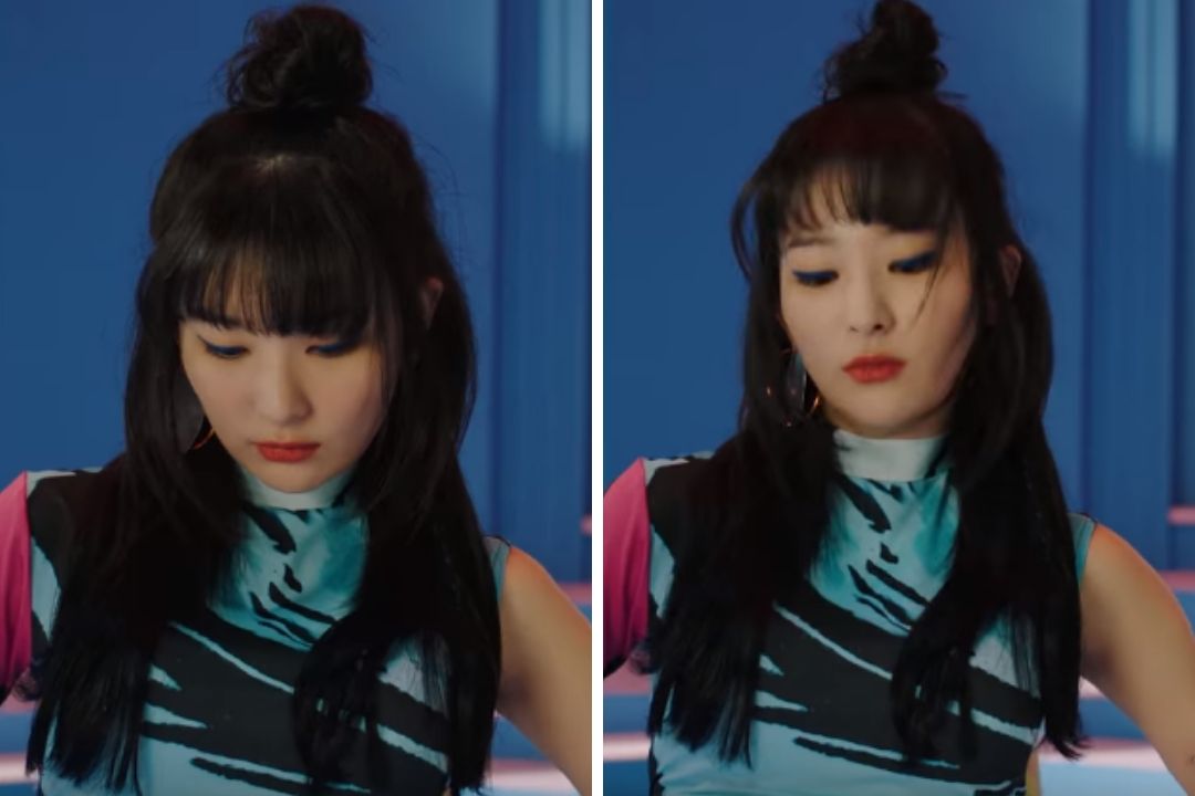 Tampaknya satu warna saja tidak cukup untuk Yeri, jadi ia memakai maskara dengan tiga warna yang berbeda: biru, pink, dan kuning. Surprisingly, gaya nyentrik ini cocok dengan persona Yeri yang cenderung imut. Kamu bisa meniru gaya ini kalau sedang malas menggunakan eyeshadow—cara pemakaiannya lebih mudah, dan matamu tetap terlihat colourful!