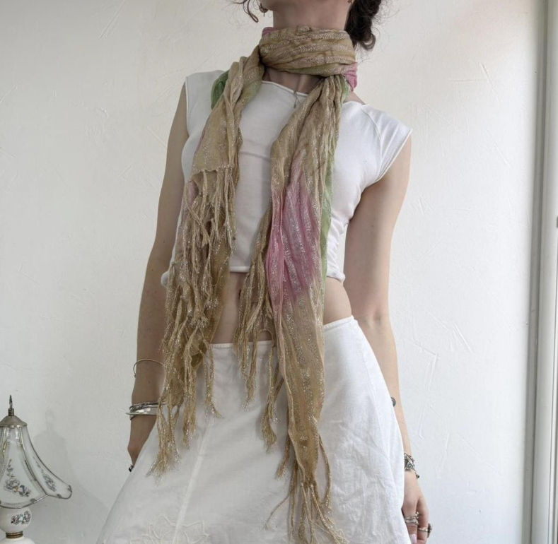 - Gunakan scarf natural beige berbahan kain yang jatuh atau sheer scarf dengan aksen yang unik. Gaya ini sangat cocok untuk tampil santai, feminin, dan rapi.