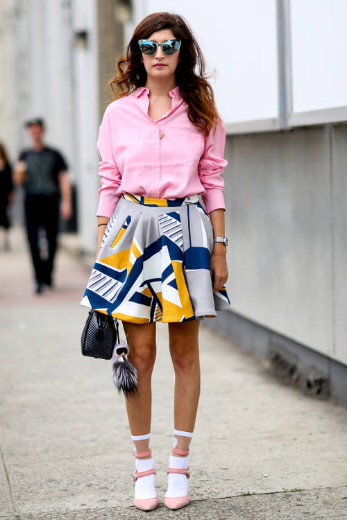 Memadukan kemeja pink dengan rok motif berwarna terang? Pilihan pas untuk weekend! Perkuat kesan girly dengan paduan sepatu ankle strap heels pink dengan kaus kaki bermotif hati. Tak ada salahnya untuk tampil sedikit nyentrik sesekali, lho. Berani coba? (Foto : Vincenzo Grillo/IMAXTREE.COM)