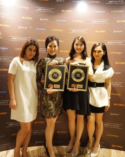 Dokter Olivia Ong, dipl. AAAM Founder Jakarta Aesthetic Clinic bersama tim dokter JAC memperlihatkan dua penghargaan Golden Record Award 2017 by Merz Asthetics For Ultherapy®.