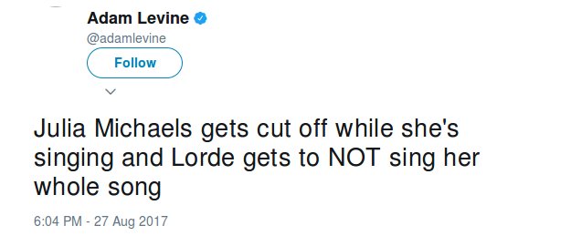 Julia Michaels merupakan seorang songwriter yang telah membuat hits untuk Justin Bieber, Selena Gomez, bahkan princess of pop, Britney Spears. Tidak mengejutkan jika wanita bertalenta ini ingin melebarkan sayap dan meluncurkan karier solo. Pasti sering dengar kan lagunya yang berjudul Issues? Penampilannya di VMA 2017 merupakan yang pertama untuk sang penyanyi. Namun tidak berakhir bahagia, penampilannya dipotong pendek untuk iklan. Mungkin ada waktu yang ingin dikejar, tapi hal ini membuat marah banyak orang, terutama frontman Maroon 5, Adam Levine. Oops....