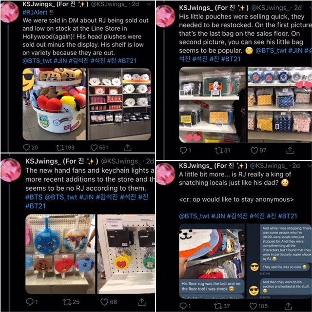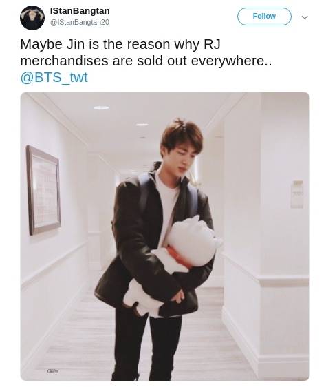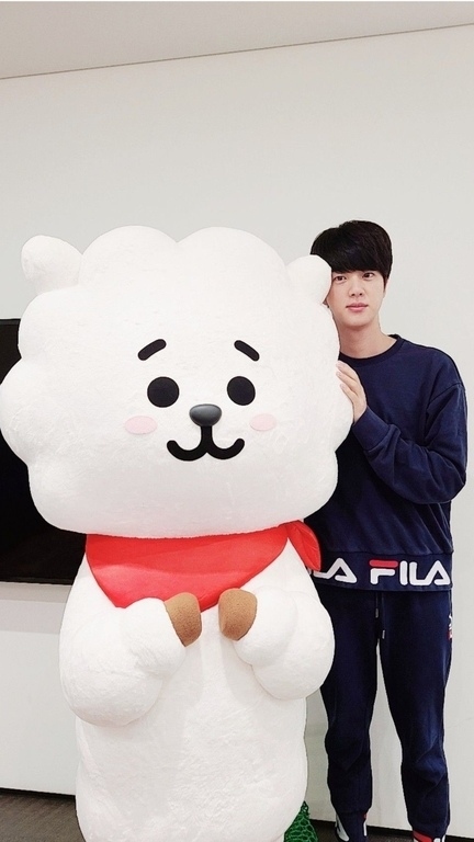 Pada ulang tahunnya yang jatuh pada tanggal 4 Desember tahun 2019 lalu, Jin BTS sempat menyebut salah satu hadiah impiannya adalah RJ berukuran 2 meter. Keinginan sang mas ganteng tersebut akhirnya benar-benar diwujudkan oleh tim Naver bulan Juli silam. Di mana mereka serius membuat RJ berukuran besar dengan bobot 40 Kg yang bahkan nyaris setinggi Jin! Saking antusiasnya mendapat hadiah RJ, Jin melalui akun twitter @bts_twt Jin menggunggah fotonya bersama sang ‘anak’. Seperti yang kita ketahui juga, pelantun Moon ini memang menjadi personil BTS yang sangat menyayangi "anaknya" tersebut. Pria bernama asli Kim Seok-jin tersebut sering kali terlihat membawa atau menggunakan aksesoris bergambar RJ.