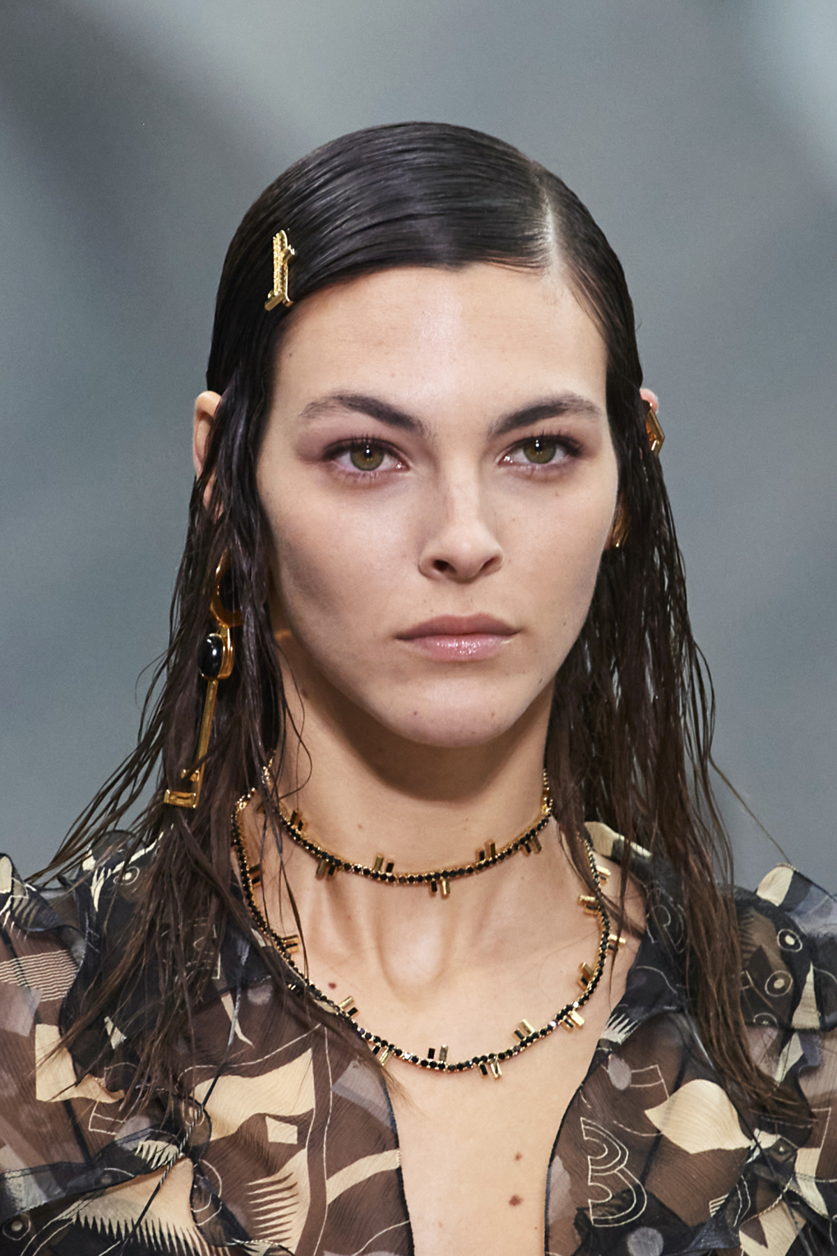 Kemudian, rumah mode Fendi menampilkan aksesori hair clip dengan vibe yang lebih edgy. Dimulai dengan wet look hair, barrette berwarna gold diberikan untuk menjaga rambut agar wajah para model terlihat bersih, disertai dengan tumpukan aksesori berwarna senada. Ternyata, hair clip tidak melulu harus disandingkan dengan girly look, ya.