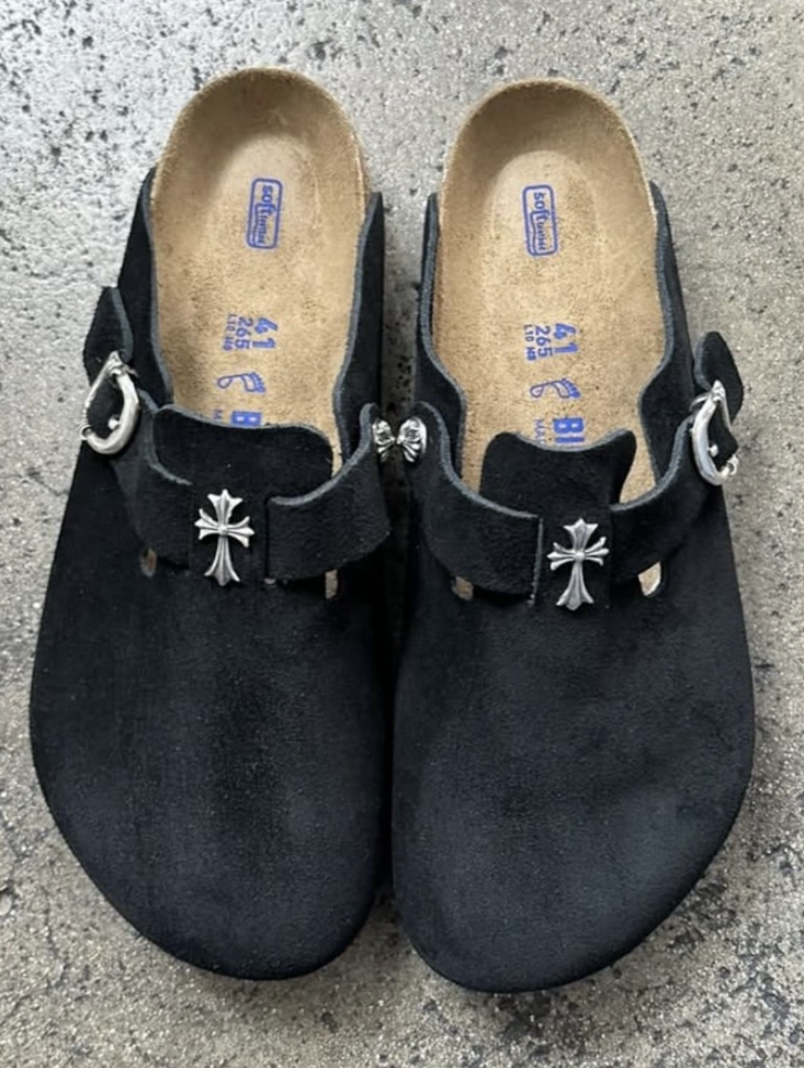 Perpaduan ini menghadirkan reinterpretasi pada salah satu siluet ikonis Birkenstock, yakni Boston clog, yang kali ini tampil dalam versi mewah berkat sentuhan khas Chrome Hearts. Dihiasi detail khas seperti ukiran perak bermotif salib.