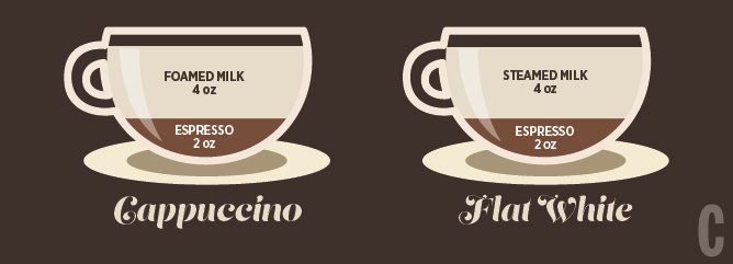 Bedanya cappuccino dengan flat white? Cappuccino memakai foamed milk yang berbusa, sedangkan flat white memakai susu yang diseduh.