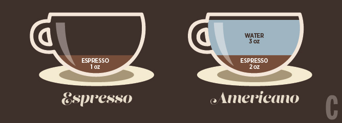 Kopi bukanlah kopi tanpa espresso. Bagi pecinta kopi yang kuat dan hanya butuh dosis kafein murni, mereka pesan espresso shots yang pahit - tanpa campuran apapun. Americano adalah espresso yang diseduh bersama air panas.