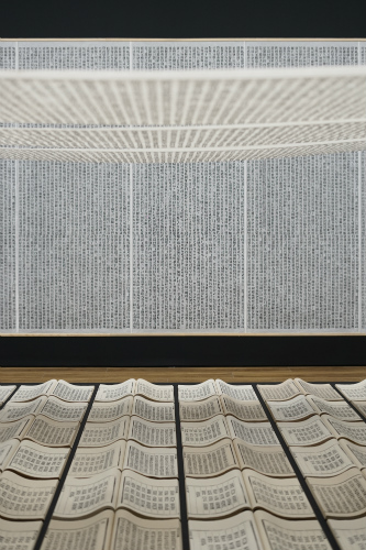Cosmo sendiri terpesona akan beberapa karya Xu Bing dalam pameran ini. Pertama adalah Book from the Sky (yang menjadi foto utama artikel dan foto di atas ini), yakni instalasi berskala masif yang dibentuk dari banyak gulungan kertas, dan menjuntai dari langit-langit hingga ke lantai. Di sini, Xu Bing menuliskan huruf yang ia ciptakan sendiri (namun tampak seperti karakter bahasa Mandarin) tanpa ada arti khusus dan seolah-olah membuat kita kesulitan untuk membaca bahkan mengartikannya.